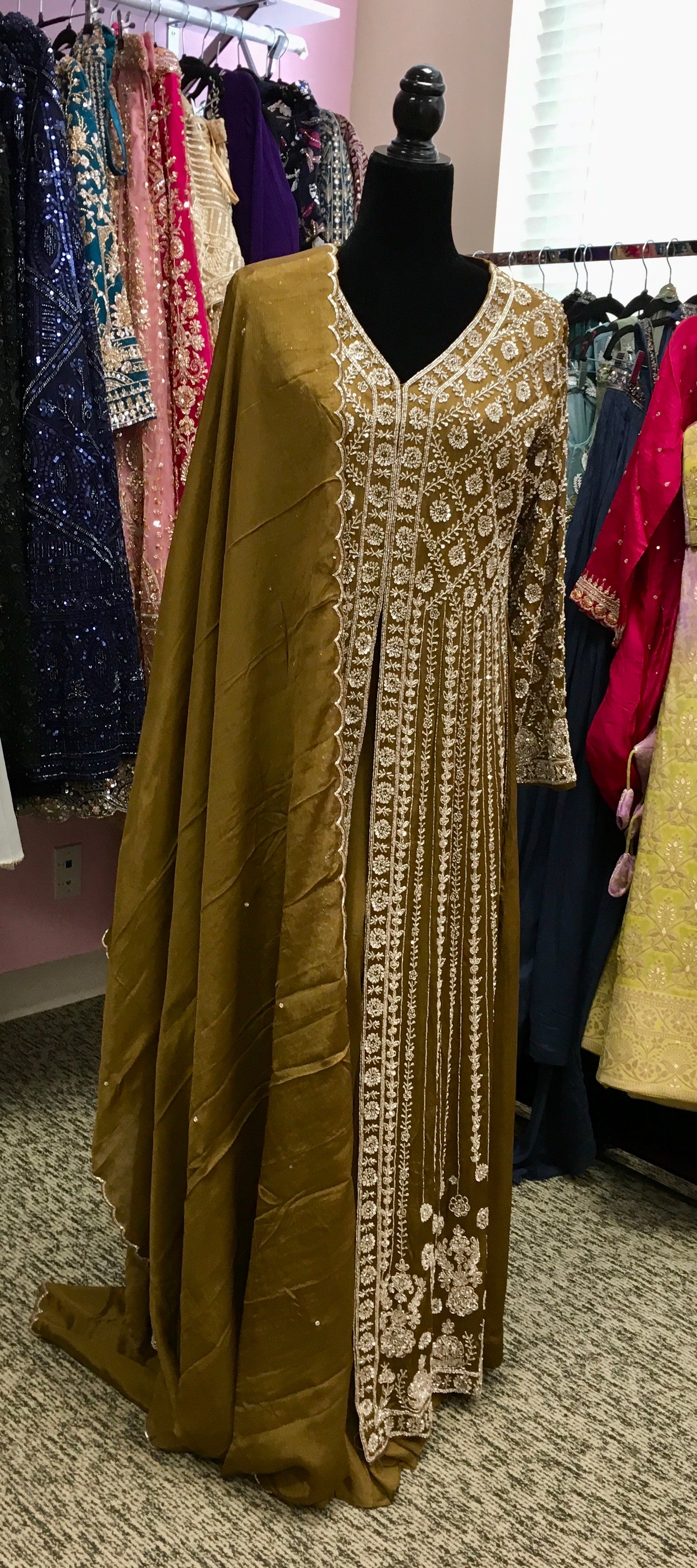 RFSS1508 - Georgette Gold print Anarkali embroidery full set with dupatta and pant(Set of 3)No reviews$105.00