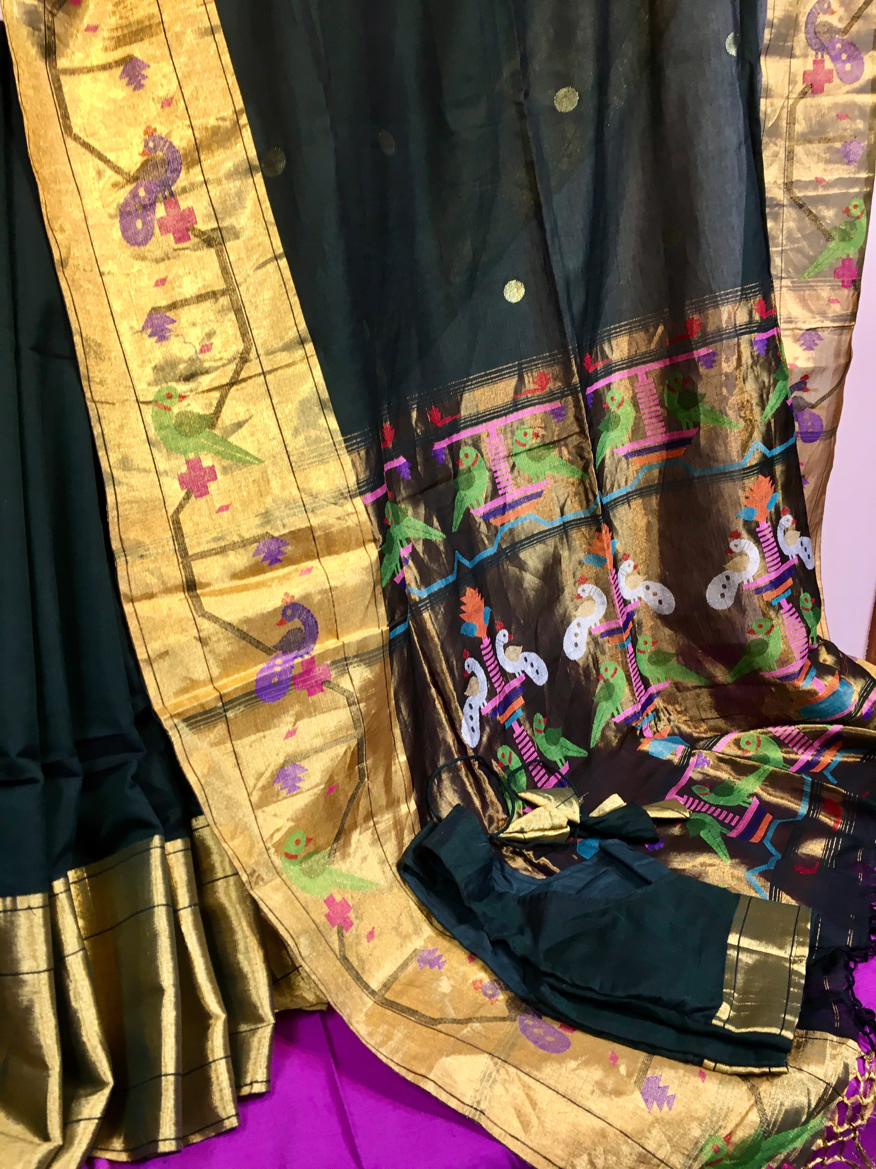 Pure Handloom Mercerized Cotton Saree in Green w/ Paithani Woven Borders and Pallu. Comes with Stitched Blouse - size 38 that can be altered up to size 42. Fall Peco done. *HANDLOOM MARK CERTIFIED*