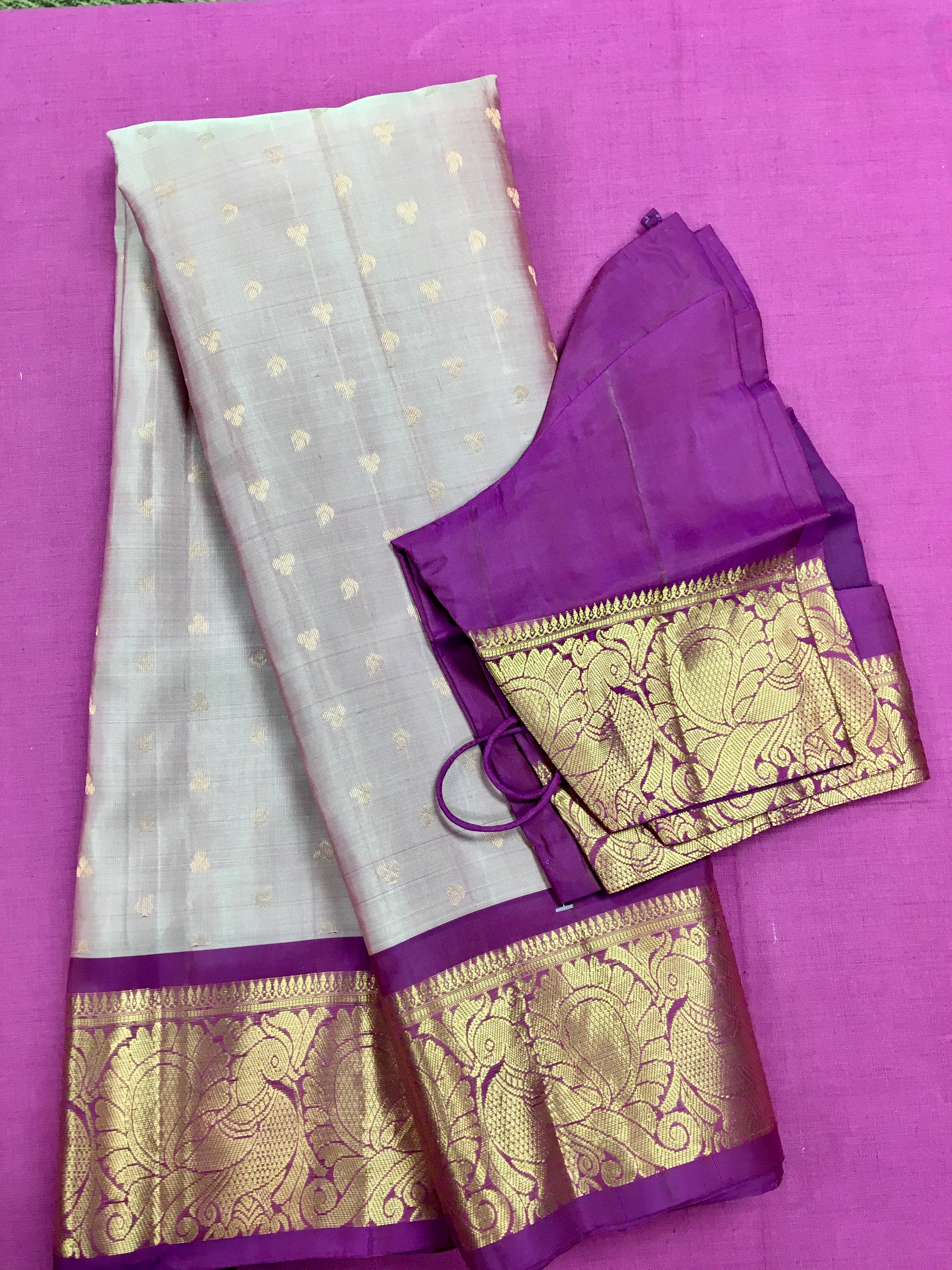 KSS441 Pure handloom kanchipuram silk Saree in pink with purple gold zari border.comes with stitched blouse size 40,can be altered to 44 size.