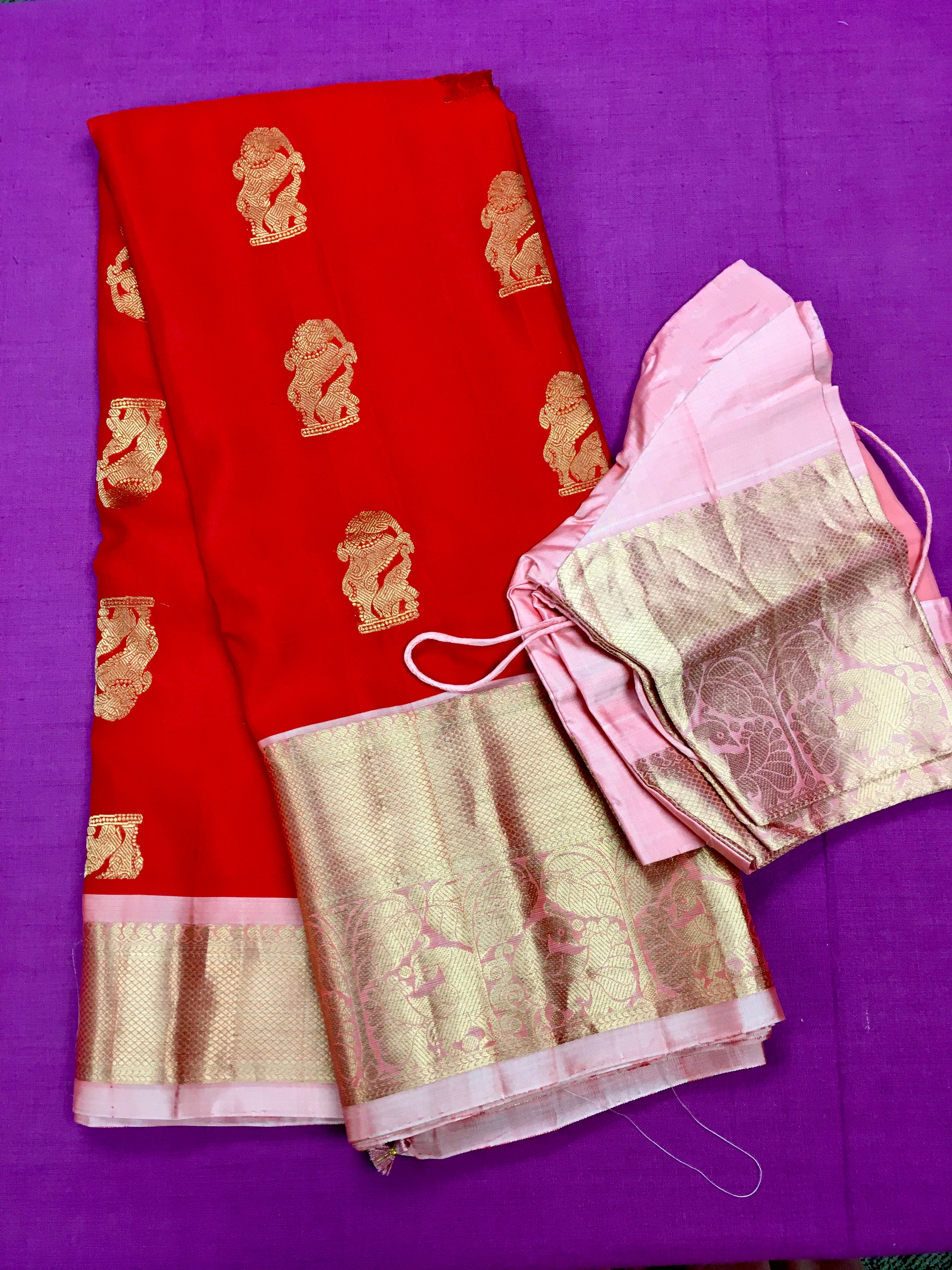 KSS444 Pure handloom kanchipuram silk Saree red with gold zari border.comes with stitched blouse size 40,can be altered to 44 size.